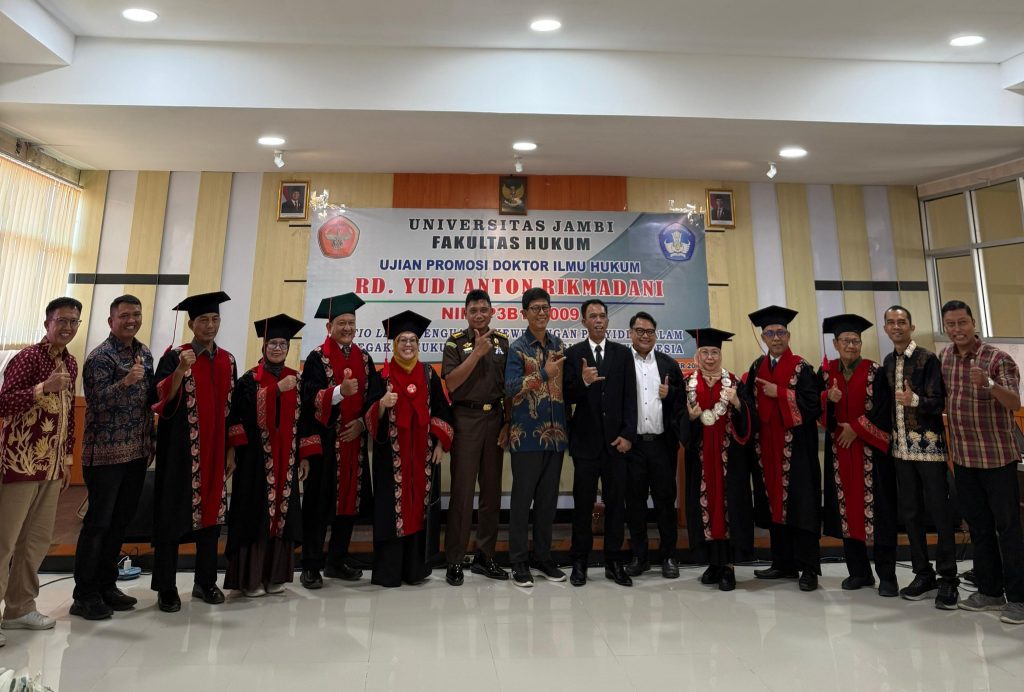 Perisaihukum.com. – Rd. Yudi Anton Rikmadani resmi menyandang gelar Doktor Ilmu Hukum setelah berhasil menuntaskan ujian akhir disertasinya di Program Doktor Ilmu Hukum Universitas Negeri Jambi (Unja). Dalam sidang terbuka promosi doktor yang digelar di kampus Unja, Yudi mempertahankan disertasi berjudul “Rasio Legis Penguatan Kewenangan Penyidik dalam Penegakan Hukum Tindak Pidana Siber di Indonesia.”
