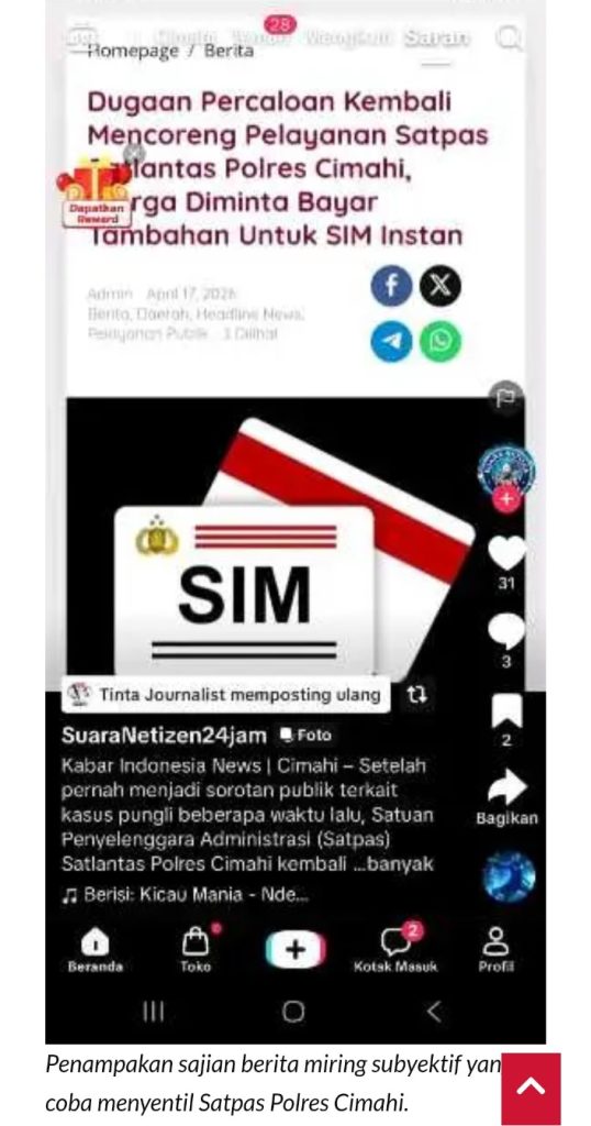 Satuan Lalu Lintas (Satlantas) Polres Cimahi secara tegas mengecam pemberitaan salah satu media online yang dinilai tidak berimbang, tidak terverifikasi, dan berpotensi melanggar hukum. Berita berjudul “Dugaan Percaloan Kembali Mencoreng Satpas Satlantas Polres Cimahi, Warga Diminta Bayar Tambahan untuk SIM Instan” yang tayang pada Jumat (17/4/2026) tersebut juga disebut tidak memenuhi standar dasar jurnalistik.